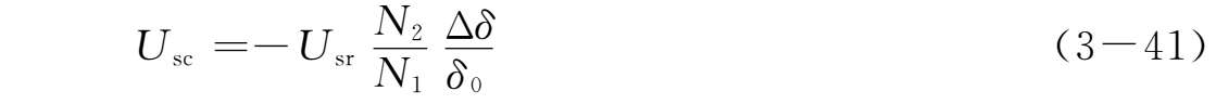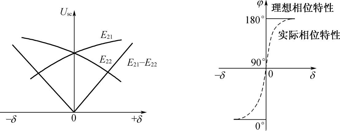 上式表明,输出电压 U sc 与衔铁位移Δ δ 之间是成比例的,其输出特性曲线如图3-10所示。由图可见,单一线圈的感应电动势 E 21 或 E 22 与铁芯的位移不成线性,两个线圈差接以后,输出电压就与铁芯的位移成线性关系了。上式中负号表示当Δ δ 向上为正时,输出电压 U sc 与电源电压 U sr 反相;当Δ δ 向下为负时,两者同相。