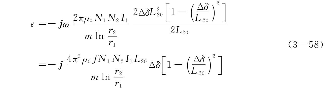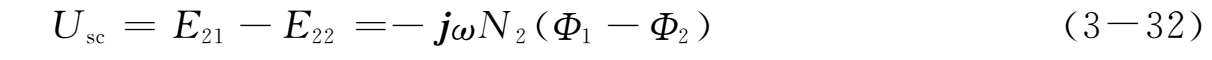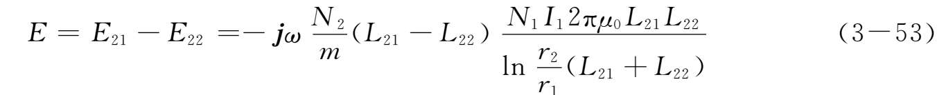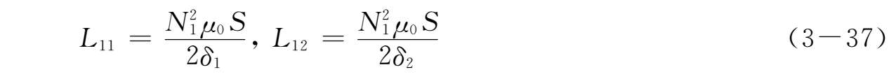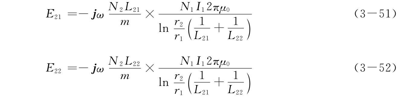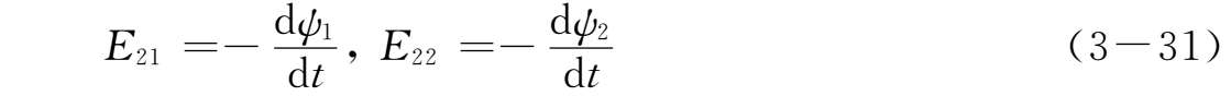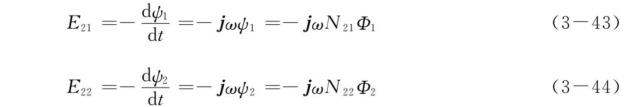 式中: N 21 和 N 22 分别为磁通穿过次级线圈1和2的匝数; Φ 1 、 Φ 2 和 ψ 1 、 ψ 2 分别为穿过次级线圈1和2的磁通和磁通匝链数。由图3-11知,磁通穿过次级线圈1的匝数为