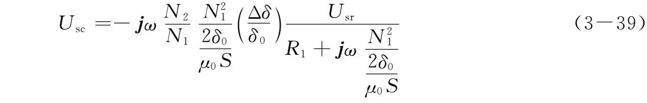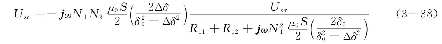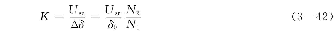 可知,传感器的灵敏度将随电源电压 U sr 和变压比 N 2 / N 1 的增大而提高,随起始间隙增大而降低。一般情况下取 N 2 / N 1 =1~2,太大时,次级线圈的输出阻抗过高,易受外部干扰的影响。必须注意,位移量要限制在一定范围内, δ 0 一般在0.5mm左右。 δ 0 过大,灵敏度要降低,而且边缘磁通将增大到不能忽略的程度,从而使非线性增大。在实际输出特性中,当 δ 0 =0时,还存在着零位电压 U 0 。