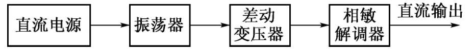 差动变压器输出的交流信号,其波形是调幅波,无法鉴别被测位移的方向。为了观察衔铁的实际运动规律,可采用差动相敏整流电路。差动变压器除测量位移外,还可以用来测量振动、加速度及压力。差动变压器从供电方式可分为交流式和直流式两种。直流式差动变压器是将直流电通过振荡器变为交流电,并将电子电路与差动变压器封装在一起,如图3-12所示。这种传感器,供给稳定的直流电,就能获得与位移成正比的直流电压输出。