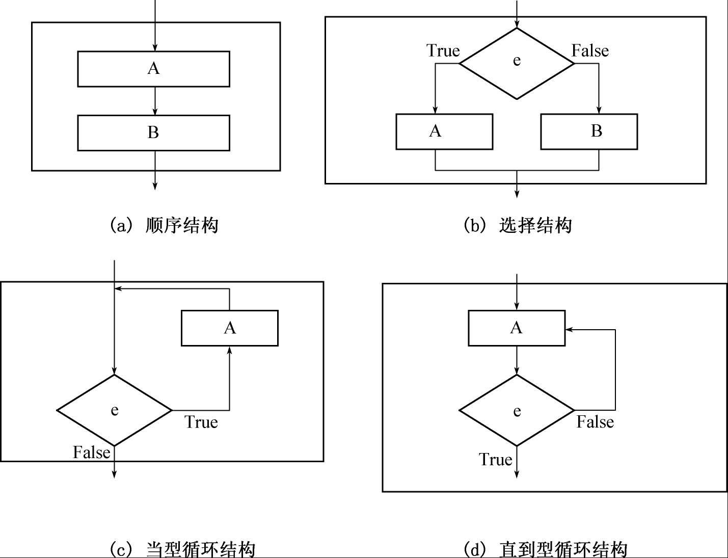 当型循环如图3-1(c)所示。如果条件e成立,执行处理A。处理A后继续判断条件e是否成立,如此反复,直到条件e不成立时结束循环。