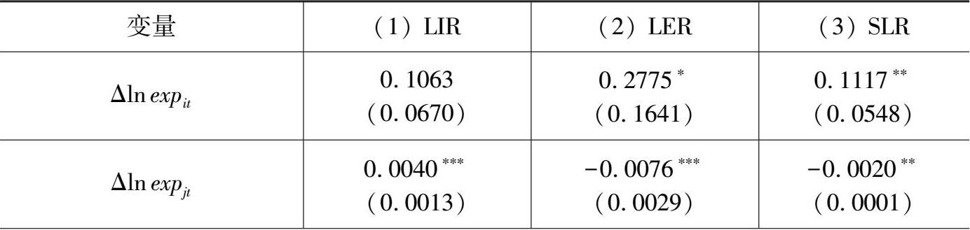 表10呈现了与表4非常近似的结果。当我们用地区融资依存度指标加权的出口总额Δln exp jt 替代地区总出口额Δln exp prov j 并重新估计式(2)时,结果显示,企业所在省份的融资依存度加权的出口集聚显著影响企业面临的融资约束。具体而言,当一个企业所在省份融资依存度加权总出口增加率上升时,会导致该企业流动性增长率上升,杠杆率和短期负债率的增长率下降,这再一次验证了竞争效应的存在。