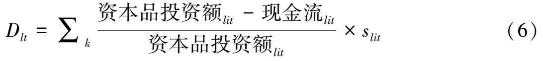 其中, D lt 表示行业 l 在 t 期的融资依存度;资本品投资额 lit 度量行业 l 中 i 企业在 t 期的资本投资额,现金流 lit 是该企业在 t 期的营运现金流; s lit 代表 i 企业在 t 期销售额占 l 行业总销售比重。因此(6)式为行业 l 中各企业利用外部融资占总投资比重的加权平均。如果一个行业现金流更大,则其融资依存度较小;反之,在融资依存度高的行业, D it 较大。