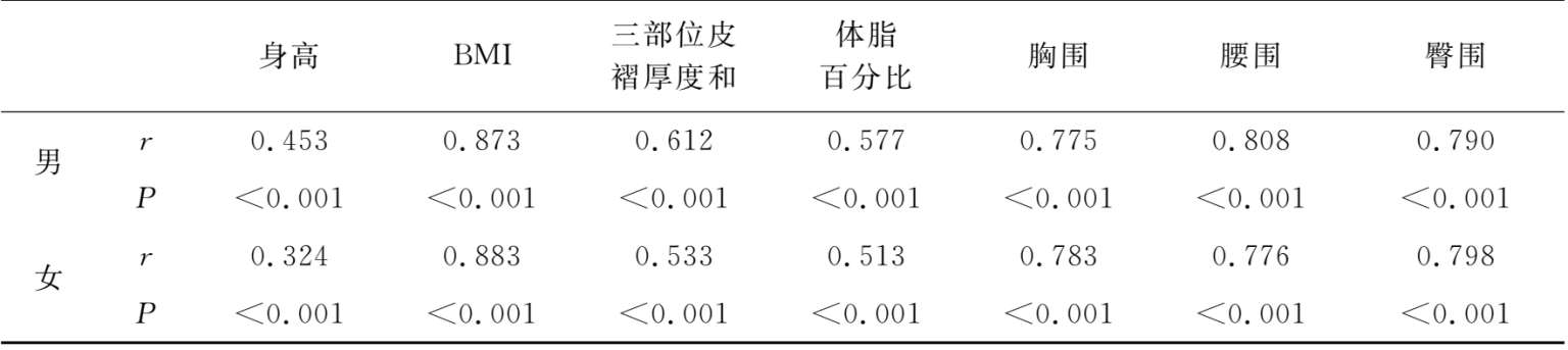 表1-33 江苏省成年人体重与其他身体形态指标的相关程度