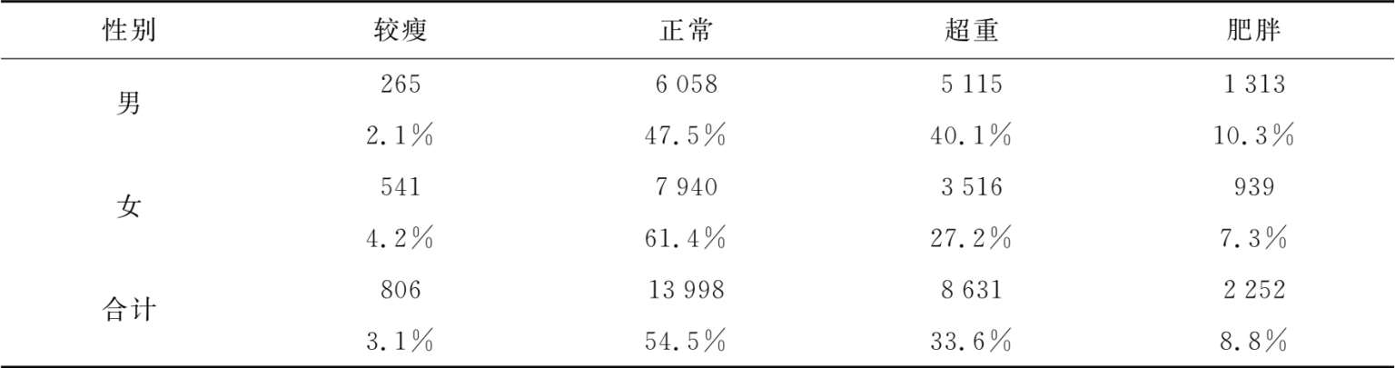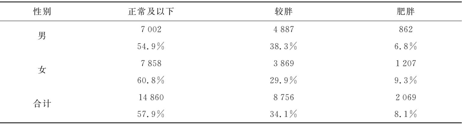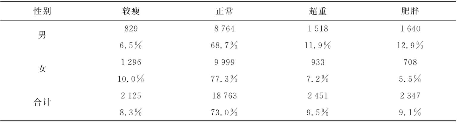 BMI是现今国际上比较通用的判定人体肥胖程度的评价指标,其公式是体重(kg)/身高的平方(m 2 )。世界卫生组织(WHO)公布的评判标准为18.5以下为偏瘦,18.5~24.9之间为正常,25.0~29.9之间为超重,30以上为肥胖。但我国专家的研究结果表明,WHO的标准并不适合中国人种的特殊情况。中国肥胖问题工作组经过研究于2002年提出适用于中国人的BMI判定标准:18.5以下为偏瘦,18.5~23.9正常,24.0~27.9超重,28以上为肥胖。目前此标准已为国内普遍接受,本研究也将采用此标准为分析依据。