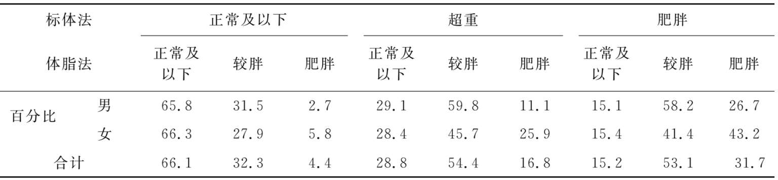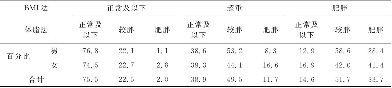 该法通过测量人体成分来判断胖瘦程度。体脂百分率的计算公式(由Brozek提出)为:(4.570/身体密度-4.142)×100,其中成年人的身体密度为,男:1.091 3-0.001 16×(上臂皮褶厚度+肩胛下角皮褶厚度);女:1.089 7-0.00133×(上臂皮褶厚度+肩胛下角皮褶厚度)。依据体脂百分率判断肥胖的标准由日本学者提出。轻度肥胖,男性:20%~24.9%,女性:30%~34.9%;中度肥胖,男性:25%~29.9%,女性:35%~39.9%;重度肥胖,男性30%以上,女性:40%以上。但此标准缺乏对偏瘦人群的分类,下文为便于与上述两种评价方法进行比较,在比较时将把轻度肥胖以下的级别归为“正常及以下”,并将轻度肥胖和中度肥胖合并为“较胖”。