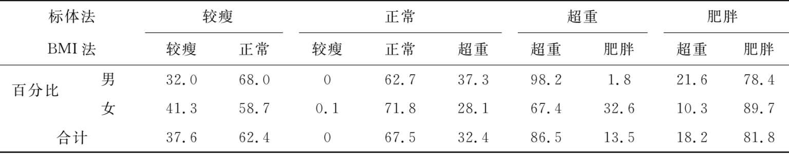 总的来说,标体法与BMI法比较的结果与这两者与体脂法比较的结果有明显不同的特征。标体法评价的结果在BMI法的分类中主要呈单向偏移的特点,其中前三类人群是向上偏移,如标体法中的较瘦人群(男女合并),在BMI评价结果中超过3/5变为正常人群;标体法中的正常人群,在BMI法中近1/3转为超重人群;标体法中的超重人群,在BMI法中超过1/10转为肥胖人群,其中女性的转化比率近1/3。只有标体法中的肥胖人群在BMI法中是向下偏移,即18.2%转化为超重人群,提示相对于标体法而言,BMI法中“较瘦”的标准相对较松,“超重”的标准相对较严,造成超重人群范围特别大。同时,标体法和BMI法的比较结果还显示,对于女性来说,BMI法的肥胖标准过严,标体法中超重的女性,在BMI法中32.6%转为肥胖(而男性的转化率只有1.8%),而标体法中肥胖的女性,在BMI法中虽然也有10.3%转为超重,但比男性低了11.3个百分点。这应该说是BMI法的体重评价未考虑性别因素所造成的结果。