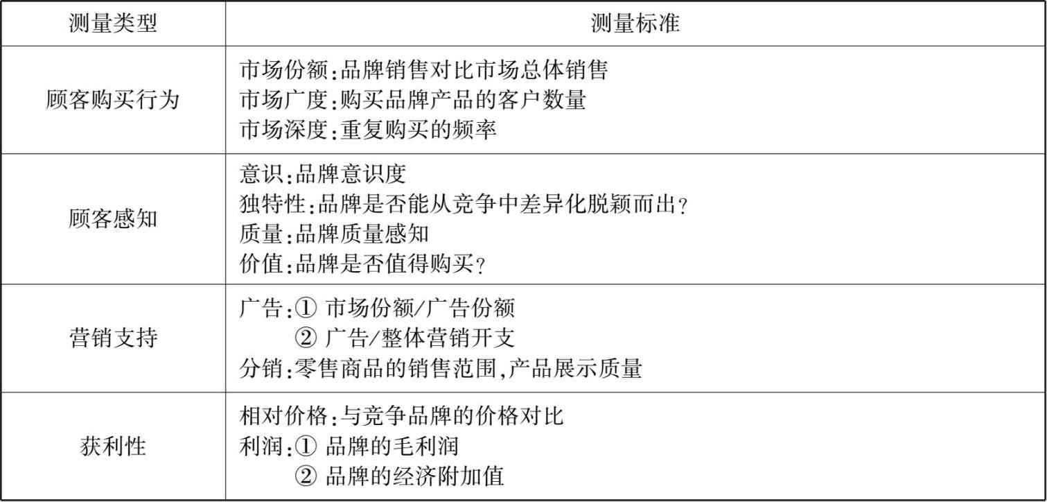 为了持续经营管理,除了要对品牌的资产进行测量外,企业还要监测它的品牌资产是否健康。品牌健康检查的指标通常包括以下一些因素,如顾客购买行为、顾客感知、营销支持获利性等。我们可以通过对这些指标的测量来判断品牌是否健康,下表列出了具体的测量标准。