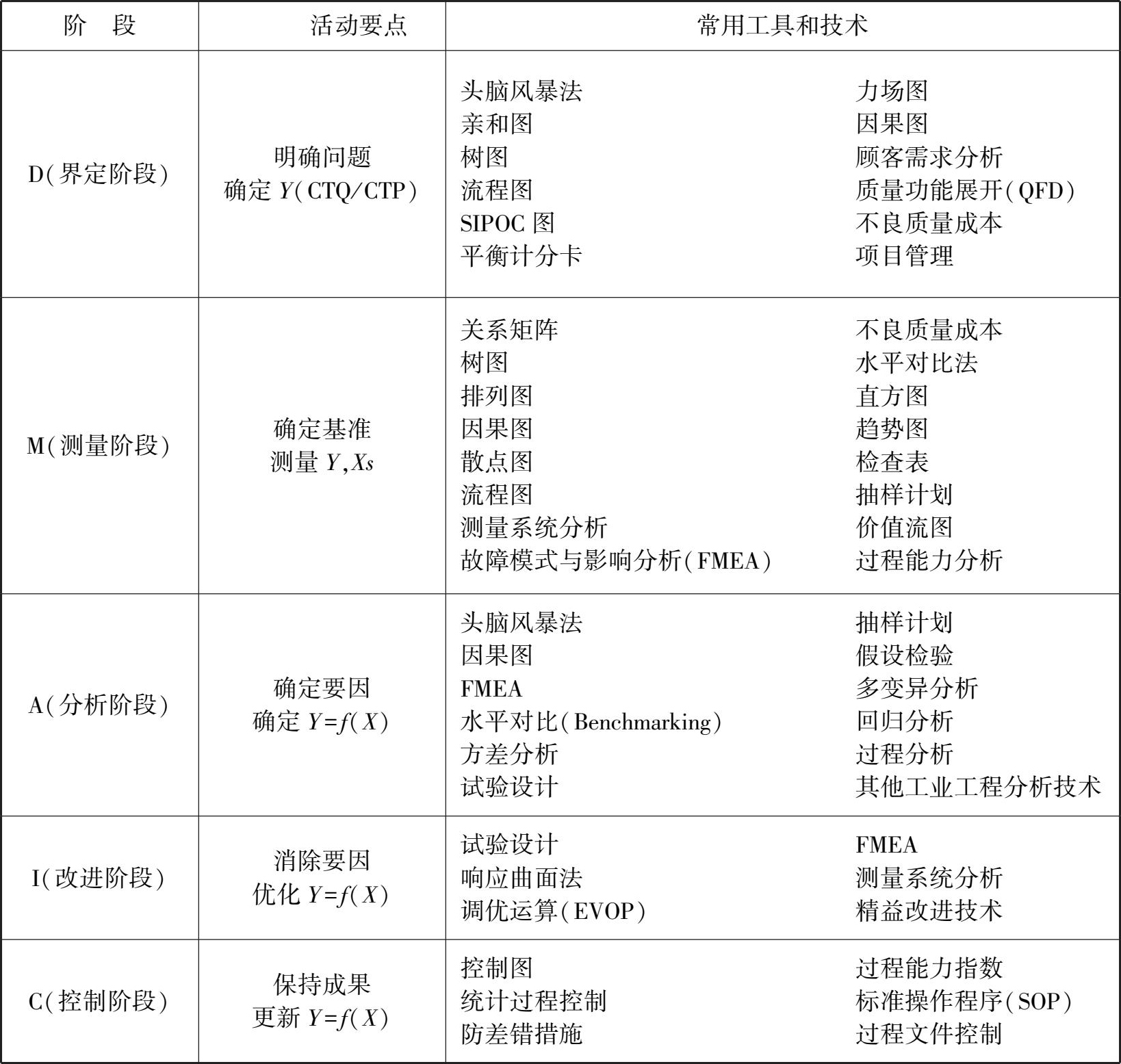 表2-3 DMAIC流程活动各阶段使用的工具和技术