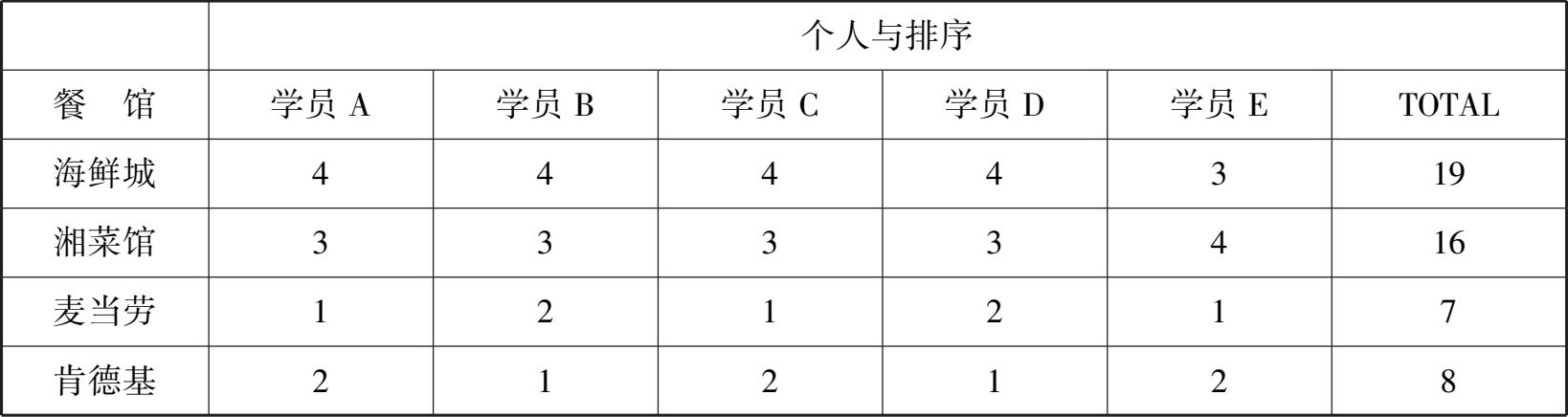 表3-5 是名义组技术应用的一个简单的案例,案例中某小组成员要决定他们让你吃午餐的地点。