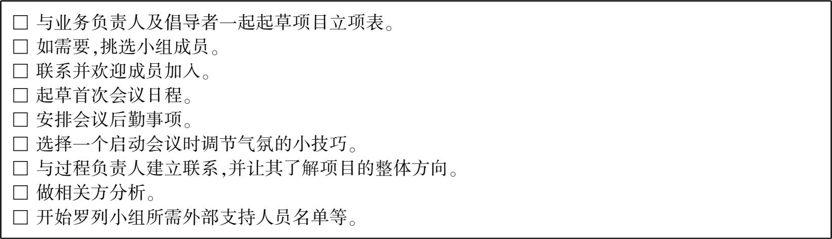 为了使团队领导/组长履行好其职责,保证项目的顺利开展,在项目启动前,需要做好相应的准备工作,表3-3 和表3-4 列出了可供团队领导/组长参考的准备工作的注意事项和活动建议。