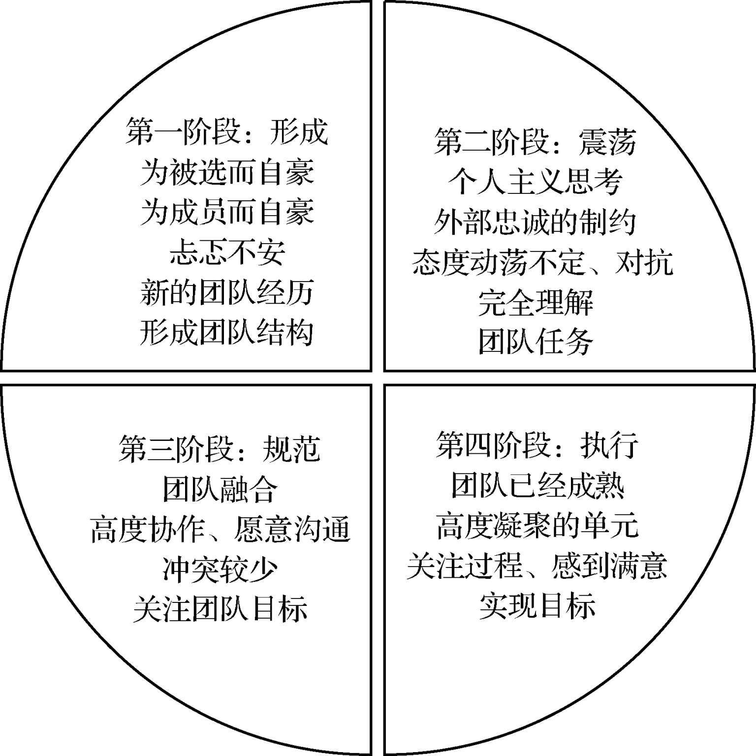 随着团队成员共同工作,团队逐步进入成长和成熟阶段。理解这些发展阶段对有效的管理团队过程是很有价值的。这些阶段可能表现出不同的强度和持续期,这取决于团队的类型、团队工作环境以及构成团队的个体。达克曼描述了项目团队发展阶段的四个阶段(见图3-2)。