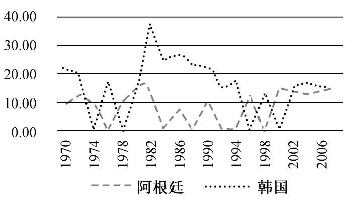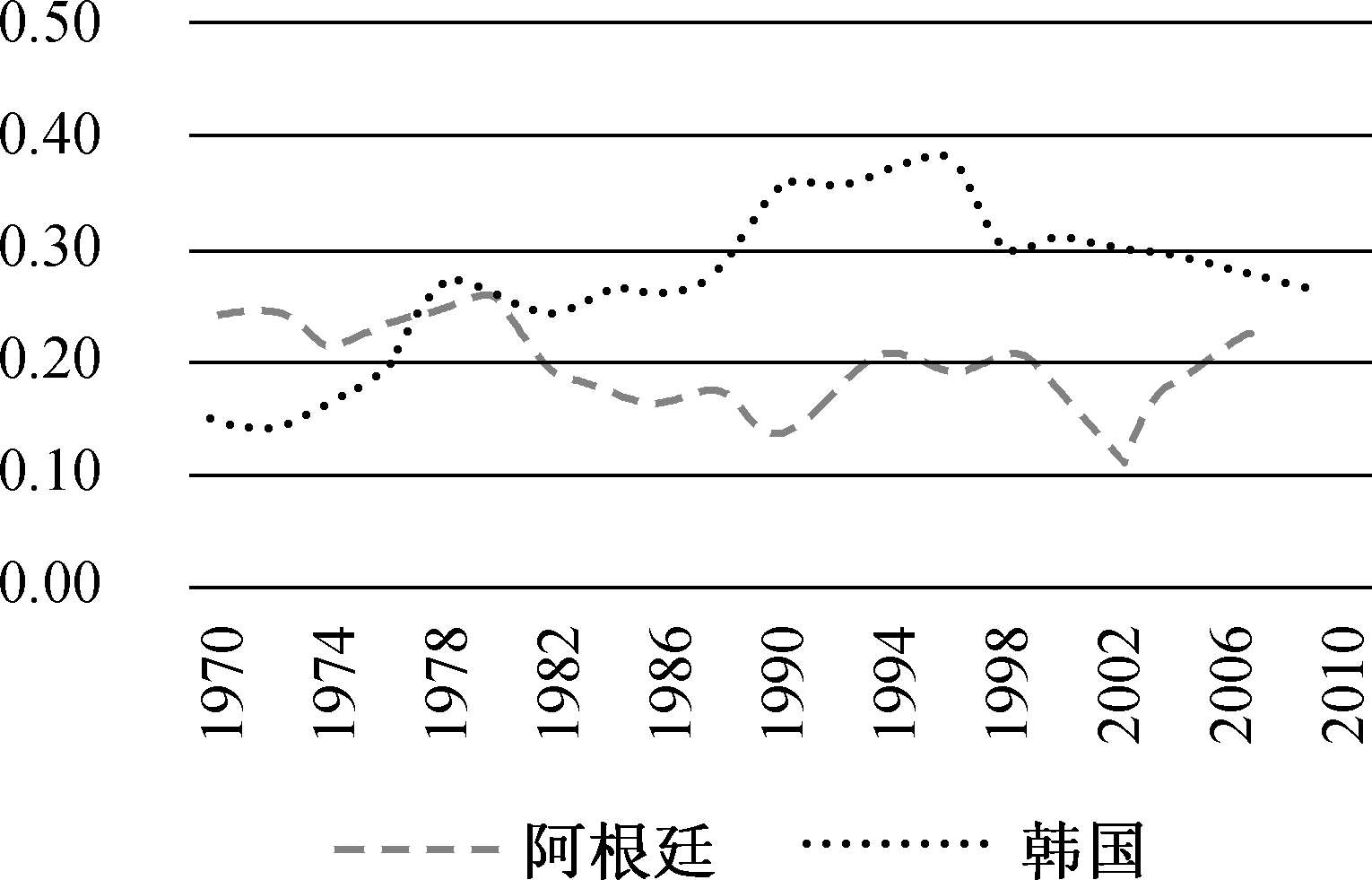 ,如果我们的模型框架能够较好地解释为何阿根廷会掉入“中等收入陷阱”而韩国没有,这也将从一定程度上给我们之前的研究结论提供经验支持。
