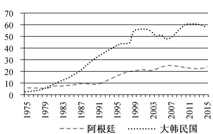 二战以后,亚洲四小龙和拉美国家都经历了二三十年的经济快速增长,成功进入到了中等收入阶段,然而 80 年代后它们的发展境况却相差巨大。亚洲四小龙成功地实现了从中等收入向高收入的跃升,创造了“东亚奇迹”,而拉美各经济体(如巴西、阿根廷、智利、乌拉圭、哥伦比亚、墨西哥等国家)则掉入到“中等收入陷阱”,经济停滞不前,有了“失去的 80 年代”。截至 2011 年,拉美地区上述国家在“中等收入陷阱”平均滞留时间达 37 年(郑秉文,2011)。接下来我们将用上文建立的理论框架来对亚洲四小龙和拉美国家做个简单的比较分析,为简便,我们将选取韩国和阿根廷作为主要代表进行分析