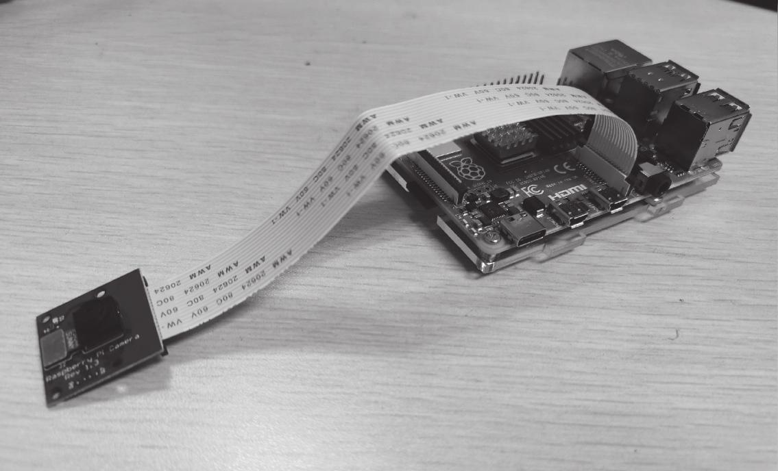 在熟悉了树莓派的操作方式后,在本节我们将使用树莓派的摄像头模块PiCamera来拍摄一张照片,如图2-23所示。树莓派开发板上提供了PiCamera摄像头模块的专用CSI接口。在安装时要将摄像头模块连接线的金属端与开发板接口处的金属端对应,此外,PiCamera不像USB接口一样支持热插拔,所以在拆卸或者安装时应切断树莓派的电源,否则容易烧坏摄像头模块。