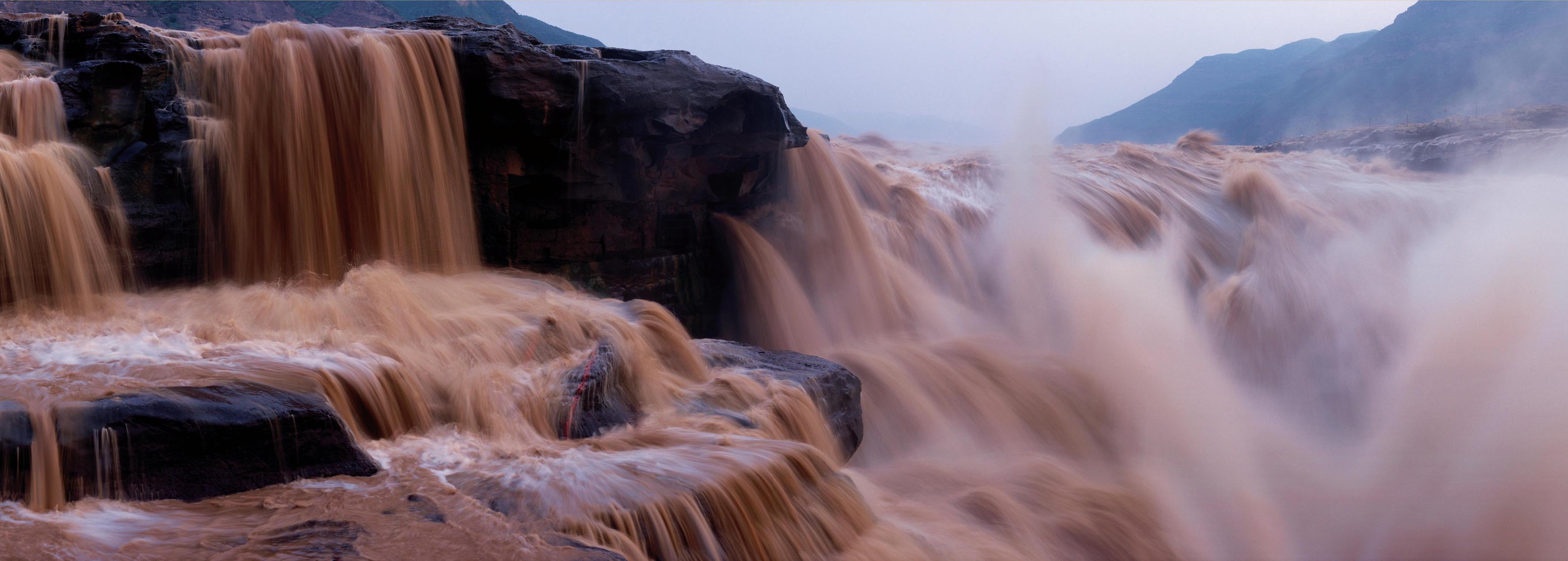 壶口瀑布位于陕西宜川县和山西吉县间的黄河干流上,是中国第二大瀑布,也是世界上最大的黄色瀑布。黄河奔流至此,两岸石壁峭立,河口收束,狭如壶口。瀑布上游黄河水面宽300米,在前进不到500米距离内,被骤然压缩到仅23—30米的宽度。每秒1000立方米的河水从20多米高的陡崖上倾注而泻,形成“千里黄河一壶收”的气概。所处的河道河床坡降大,河谷下切作用强烈,河谷断面在这一带呈U形状态,开阔宽展的谷地中河水以瀑布形式再次在河床中央又下切,形成特殊的谷中谷现象。