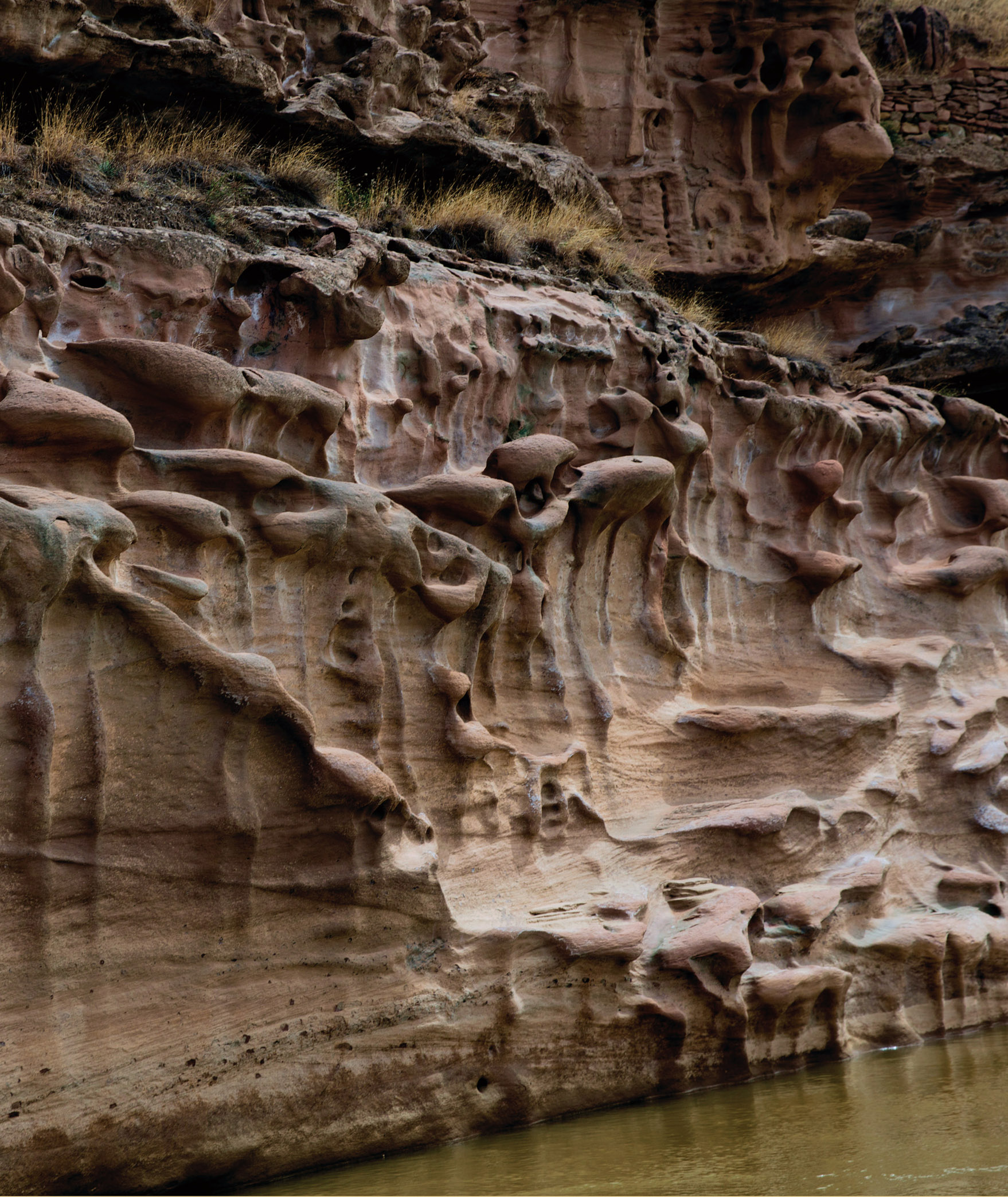 山西临县和陕西佳县间的黄河段两岸,由于流水侵蚀,河谷下切,加上岸边出露基岩主要是第三系砂岩夹薄层泥岩,岩性差异性明显,在河水冲刷和风化作用下形成状态各异的水蚀地貌。从克虎、曲峪到碛口的黄河沿岸,黄河流水侵蚀地貌景观最为著名。由于厚层砂岩内含有大量正长石和石英石,在地下水溶蚀、河流冲蚀、风蚀和日照条件下,正长石逐渐分化分解,石英石从厚层砂岩中脱落下来,因此在砂岩中形成了石沟、石龛、石窟、石书等形状及各种动物形态的天然崖壁浮雕。
