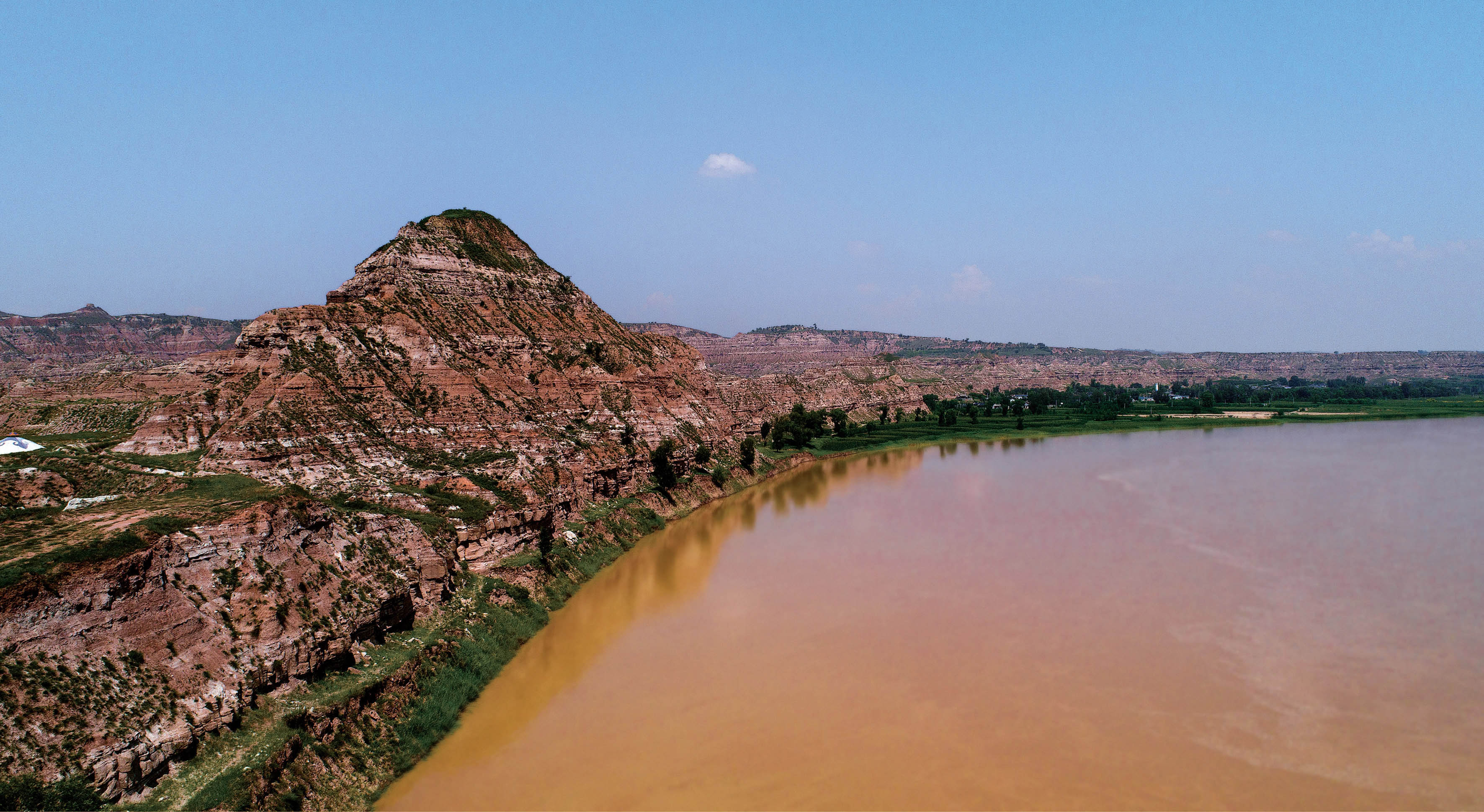 ◆黄河在悬崖峭壁中反复曲折,形成一个接一个的大湾。在包子塔湾转了一个近360度的圆弯,将岸壁围成一个半岛。