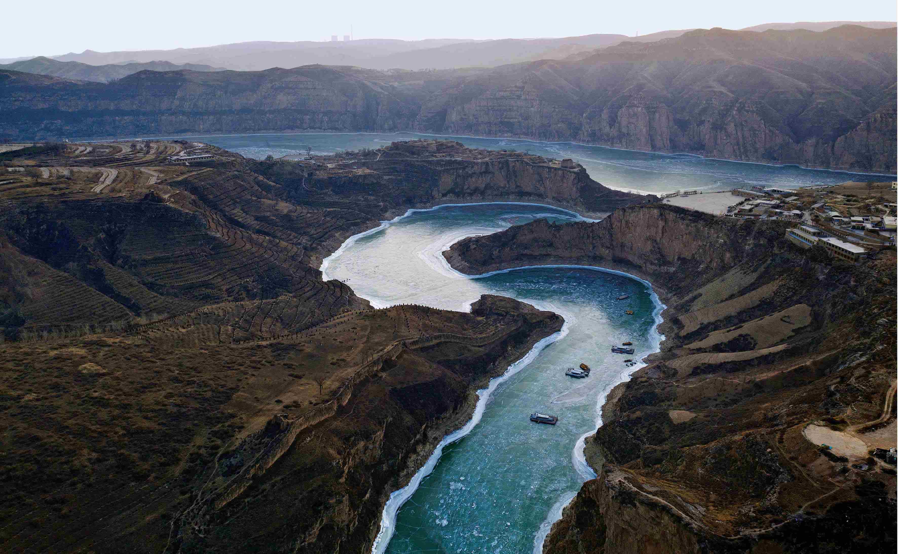 流出准格尔旗后,黄河正式进入晋陕峡谷,东岸是山西省保德县,西岸是陕西省府谷县。该段河道受河势影响,冬天容易形成冰凌,宽阔的河道上遍布白色的形态各异的凌花,冰盖不断延伸,层层堆积,高低错落,颇为壮观。但冰凌阻塞河道,容易诱发地质灾害。