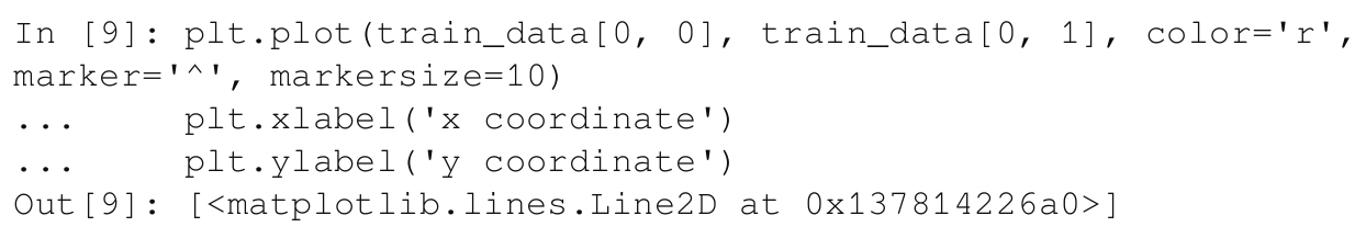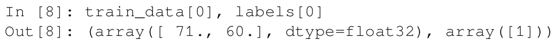 5)正如我们在上述输出中看到的那样,train_data变量是一个11×2的数组,每一行对应一个数据点。通过在数组中建立索引来查看第一个数据点及其对应的标签:
