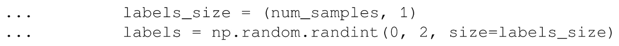类似地,我们要创建一个向量,包含(0, 2)范围内的一个随机整数标签,对于所有样本: