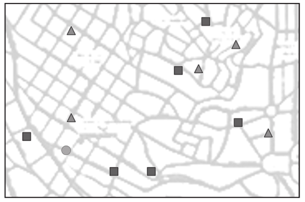 我们相信可以预测红队球迷的生活区,开始记录我们的活动轨迹。如果我们路过红队球迷的家,则会在手边的城镇地图上画一个红色的三角形;否则会画一个蓝色的正方形。一段时间后,我们对每个人的居住地有了一个很好的了解,如图3-3所示。