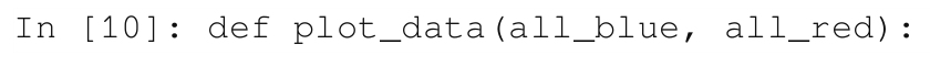 7)但是,如果我们想一次看到整个训练集呢?让我们为此编写一个函数。应该把所有蓝色方块数据点的列表(all_blue)以及所有红色三角形数据点的列表(all_red)作为函数的输入: