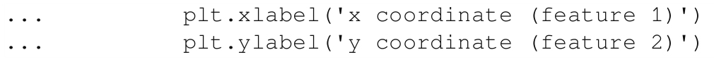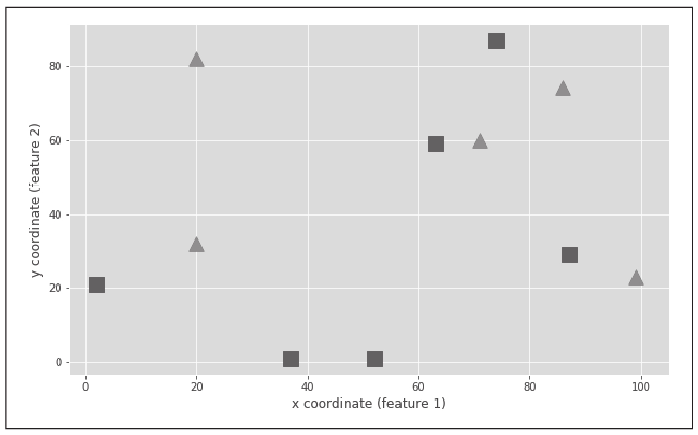 在前面的例子中,每个数据点都是城镇地图上的一个房子。每个数据点都有两个特征(即数据点在城镇地图上的位置坐标x和y)以及一个类标签(即蓝队球迷居住地是一个蓝色方块,红队球迷居住地是一个红色三角形)。