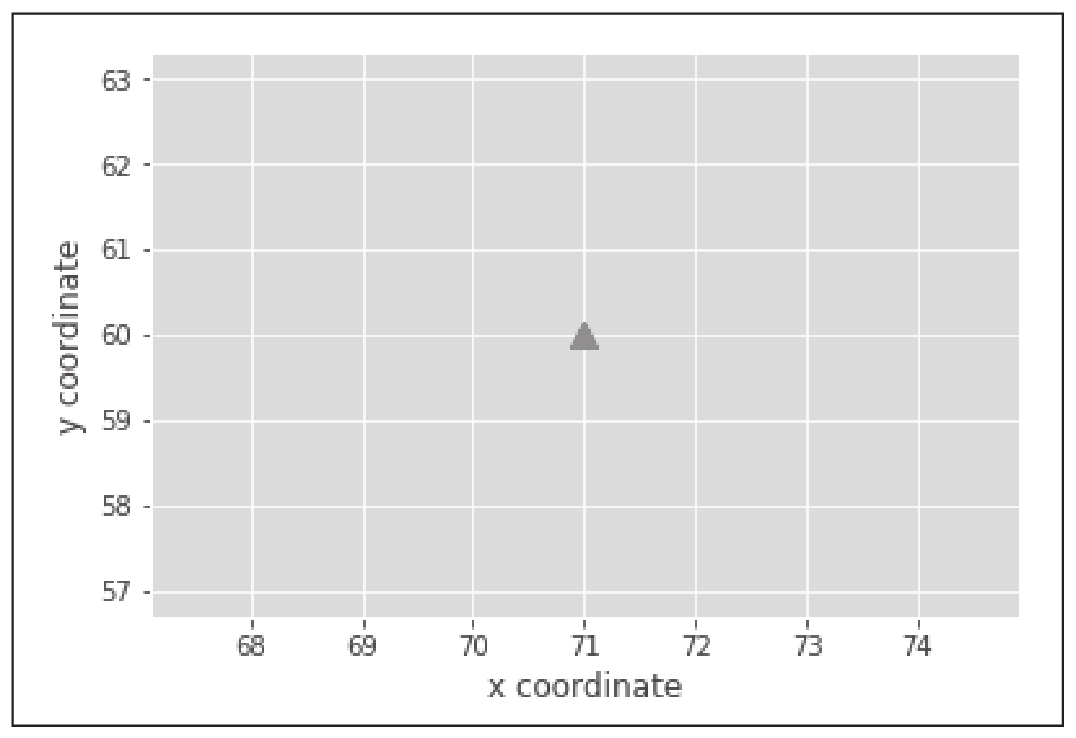 6)这就告诉我们第一个数据点是一个红色三角形(因为它的类是1),在城镇地图上的位置是(x, y)=(71, 60)。如果需要,我们可以使用Matplotlib绘制城镇地图上的这个数据点: