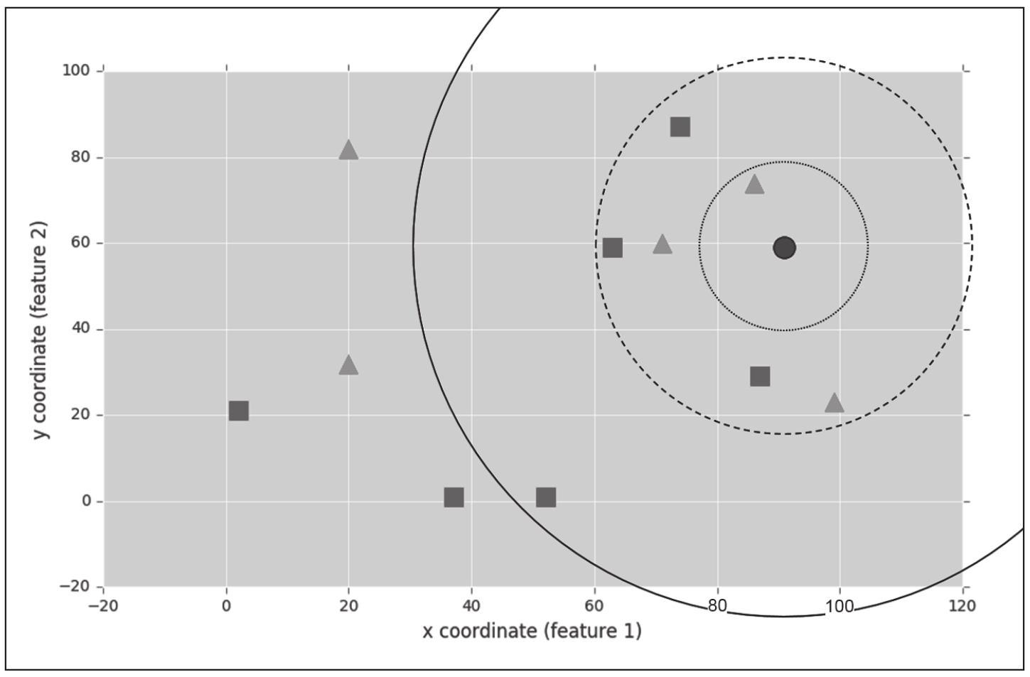 最后,如果我们扩大搜索窗口,根据k=7的最近邻居对新数据点进行分类,结果会怎样呢(图3-6中的实线圆圈)?