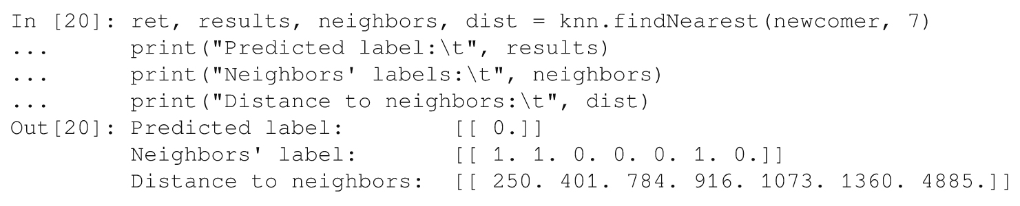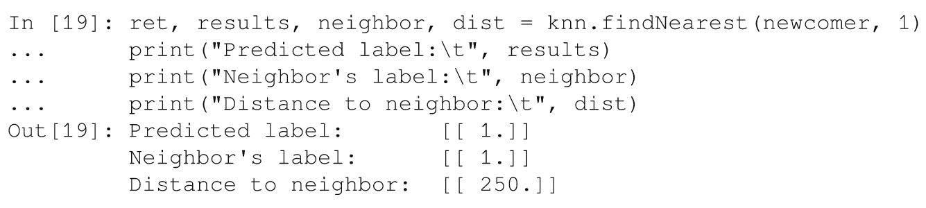 使用OpenCV,通过cv2.ml.KNearest_Create()函数我们可以很容易创建一个k-NN模型。构建模型包括下列步骤: