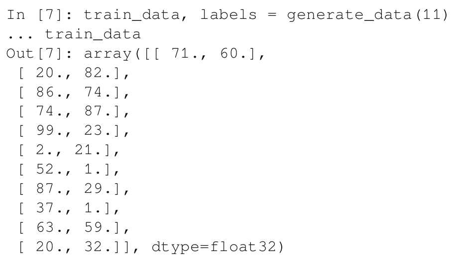 第一步是生成一些训练数据。为此,我们将使用NumPy的随机数生成器。正如3.2节讨论过的,我们将固定随机数生成器的种子,这样重新运行脚本总是可以生成相同的值: