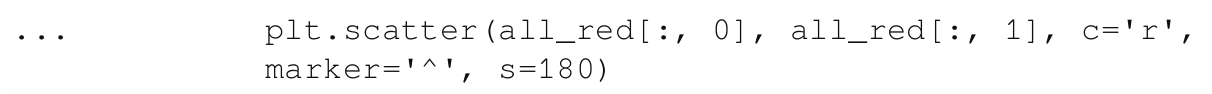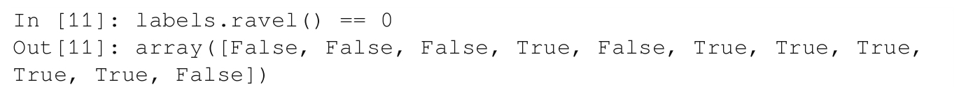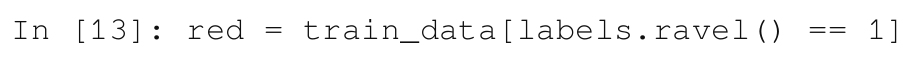 11)让我们在数据集上试试看!首先,我们必须将所有的数据点拆分成红色数据集和蓝色数据集。使用下列命令,我们可以快速选择前面创建的label数组中所有等于0的元素(ravel平展数组):