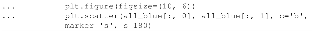 8)我们的函数应该把所有的蓝色数据点绘制成蓝色方块(使用颜色“b”和标记“s”),这可以使用matplotlib的scatter函数来实现。为了使其可以工作,我们必须以一个N×2的数组形式传递蓝色数据点,其中N是样本数。然后,all_blue [:, 0]包含数据点的所有x坐标,all_blue[:, 1]包含数据点的所有y坐标: