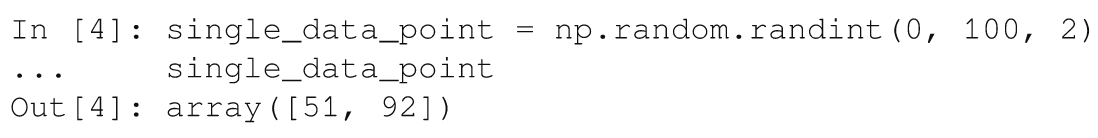 在上述输出中我们可以看到,这将在0到100之间选择两个随机整数。我们把第一个整数解释为地图上数据点的x坐标,第二个整数解释为数据点的y坐标。