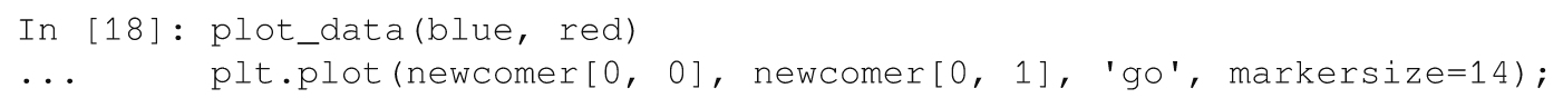 让我们再来看看我们的城镇地图。我们将像前面那样绘制训练集,而且还将新数据点添加为一个绿色圆圈(因为我们还不知道这个数据点应该是蓝色方块还是红色三角形):