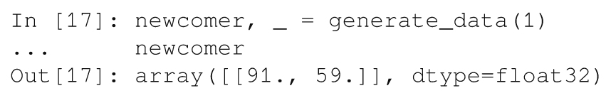 因此,单个数据点的特征在城镇地图上可以用x和y坐标的一个二元向量来表示。类似地,如果是一个蓝色方块,那么标签是0;如果是一个红色三角形,那么标签是1。这个过程包括数据点生成、数据点绘制以及新数据点的标签预测。让我们来看看如何实现这些步骤: