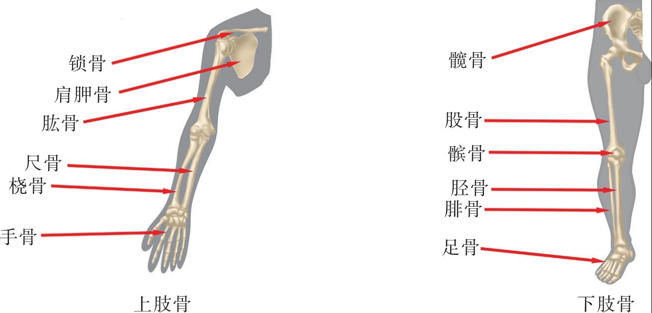 (1)上肢骨:由锁骨、肩胛骨、肱骨、尺骨、桡骨、手骨(腕骨、掌骨和指骨)组成。