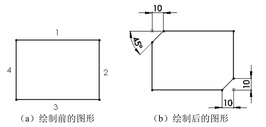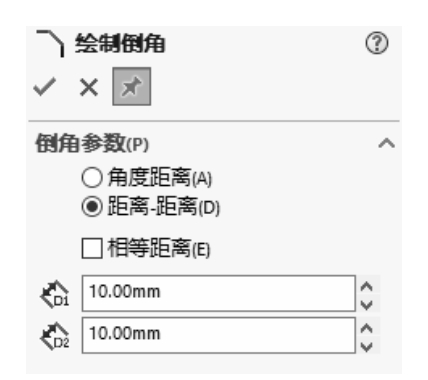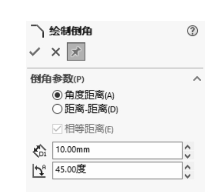 绘制倒角工具可将倒角应用到相邻的草图实体中,此工具在二维和三维草图中均可使用。倒角的选取方法与圆角的相同。“绘制倒角”属性管理器中提供了倒角的两种设置方式,分别是“角度距离”设置方式和“距离-距离”设置方式。