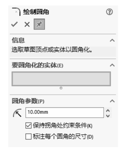 (2)在“绘制圆角”属性管理器中,设置圆角的半径。如果顶点具有尺寸或几何关系,勾选“保持拐角处约束条件”复选框,将保留虚拟交点。如果不勾选该复选框,且顶点具有尺寸或几何关系,将会询问是否想在生成圆角时删除这些几何关系。