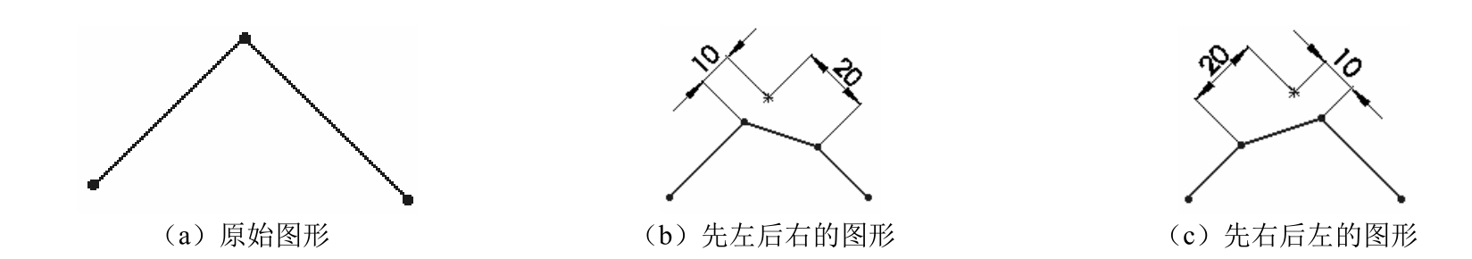 以“距离-距离”设置方式绘制倒角时,如果设置的两个距离不相等,选择不同草图实体的次序不同,绘制的结果也不相同。如图2-50所示,设置 D 1 =10mm、 D 2 =20 mm,如图2-50(a)所示为原始图形;如图2-50(b)所示为先选取左侧的直线,后选择右侧直线形成的倒角;如图2-50(c)所示为先选取右侧的直线,后选择左侧直线形成的倒角。