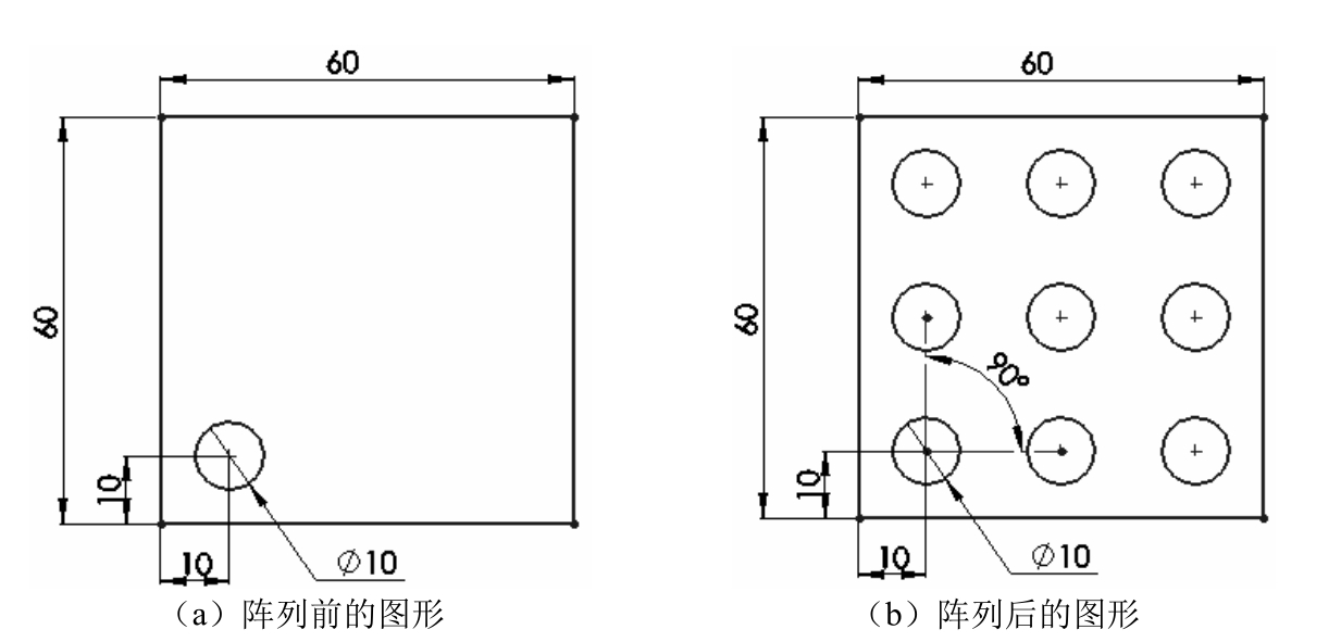 以如图2-63所示为例说明线性草图阵列的过程,图2-63(a)为阵列前的图形,图2-63(b)为阵列后的图形,其操作步骤如下。