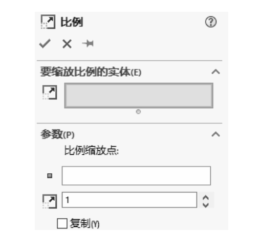缩放实体比例,是指通过基准点和比例因子对草图实体进行缩放,也可以根据需要在保留原缩放对象的基础上缩放草图。执行该命令时,系统弹出的“比例”属性管理器如图2-70所示。