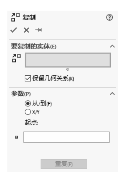 复制实体,是指将一个或者多个草图实体进行复制。执行该命令时,系统弹出的“复制”属性管理器如图2-67所示。“复制”属性管理器中的参数与“移动”属性管理器中的参数意义相同,在此不再赘述。