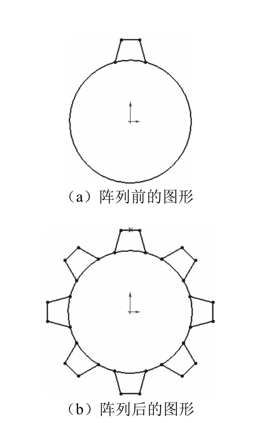 以如图2-65所示为例说明圆周草图阵列的过程,图2-65(a)为阵列前的图形,图2-65(b)为阵列后的图形,其操作步骤如下。