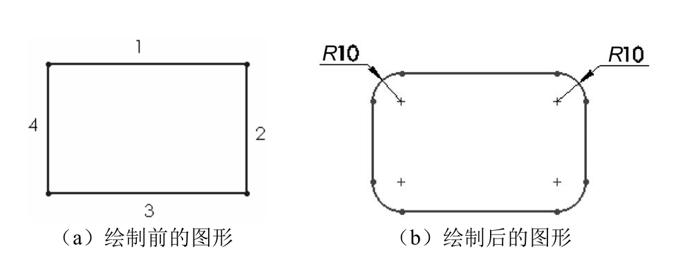 (3)设置好“绘制圆角”属性管理器后,单击选择如图2-46(a)所示的直线1和2、直线2和3、直线3和4、直线4和1。