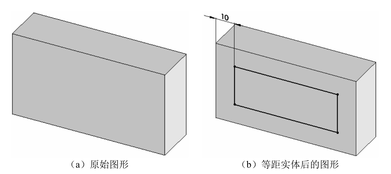如图2-53所示为在模型面上添加草图实体的过程,图2-53(a)为原始图形,图 2-53(b)为等距实体后的图形。执行过程为:先选择如图 2-53(a)所示模型的上表面,然后进入草图绘制状态,再执行“等距实体”命令,设置参数为单向等距距离,距离为10mm。