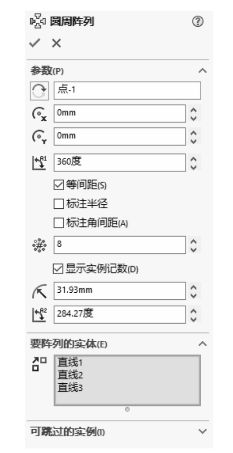 圆周草图阵列是将草图实体沿一个指定大小的圆弧进行环状阵列的工具。执行该命令时,系统弹出的“圆周阵列”属性管理器如图2-64所示。