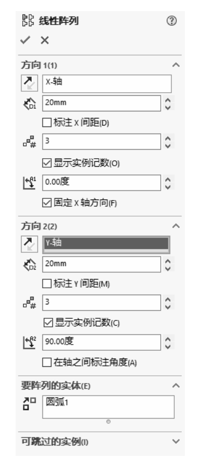 (3)此时系统弹出“线性阵列”属性管理器,单击“要阵列的实体”框,然后在图形区中选取如图2-63(a)所示的直径为10mm的圆弧,其他设置如图2-62所示。