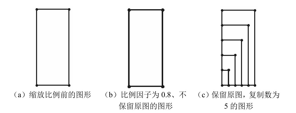 以如图2-71所示为例说明缩放草图的过程,图2-71(a)为缩放比例前的图形,图2-71(b)为比例因子为0.8、不保留原图的图形,图2-71(c)为保留原图,复制数为5的图形,其操作步骤如下。